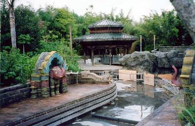 between two elephant sculptures. The elephants may spray you with water.